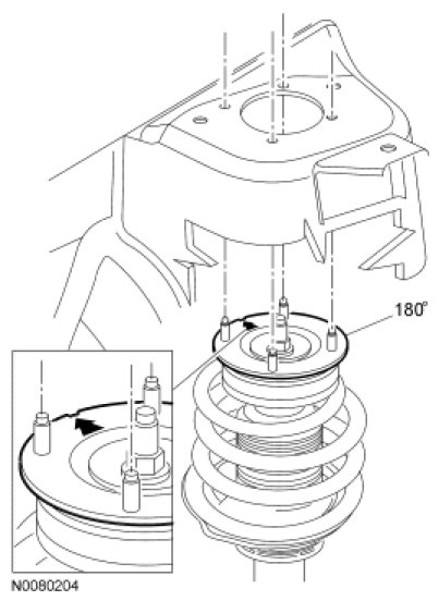4. NOTE: Do not rotate the strut mount to any other position than 180 degrees from its original position, the notch (located on top of the strut mount) must either point inward (towards the engine) or outward (towards the fender).