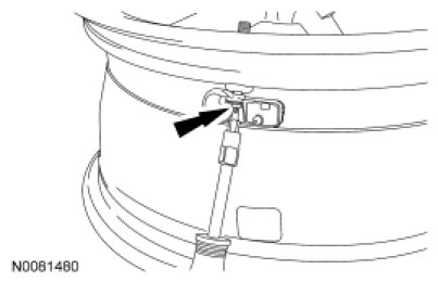 2. NOTICE: The valve stem is connected to the Tire Pressure Monitoring System (TPMS) sensor. Do not pull the valve stem from the wheel, or damage to the sensor will occur.