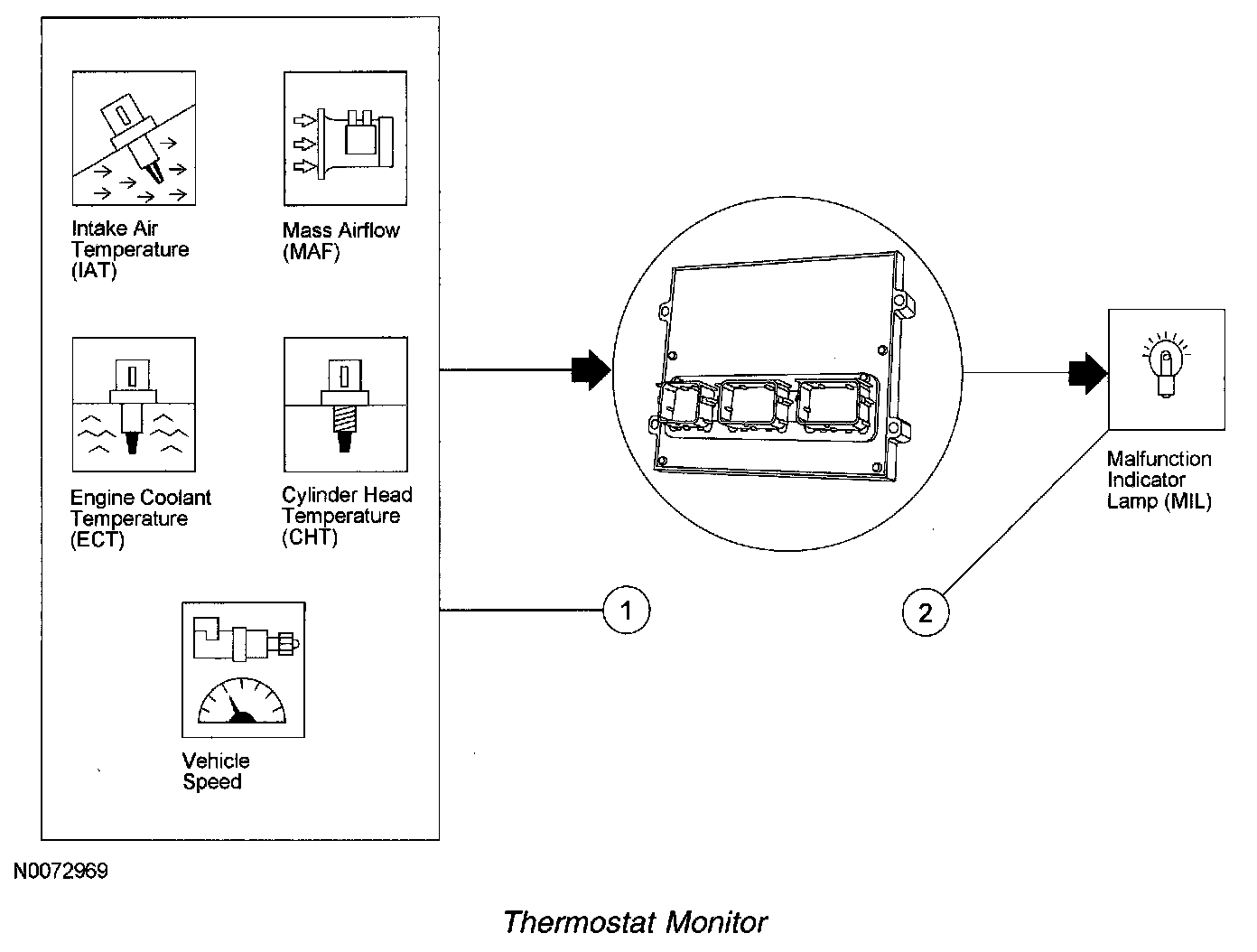 THERMOSTAT MONITORThe thermostat monitor is designed to verify correct thermostat operation. This monitor is executed once per drive cycle and has a monitor run duration of 300-800 seconds. If a concern is present, diagnostic trouble code (DTC) P0125 or P0128 is set and the malfunction indicator lamp (MIL) is illuminated.