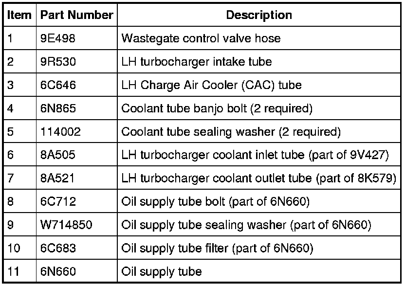 10. Remove the 2 LH oil return tube-to-turbocharger bolts.