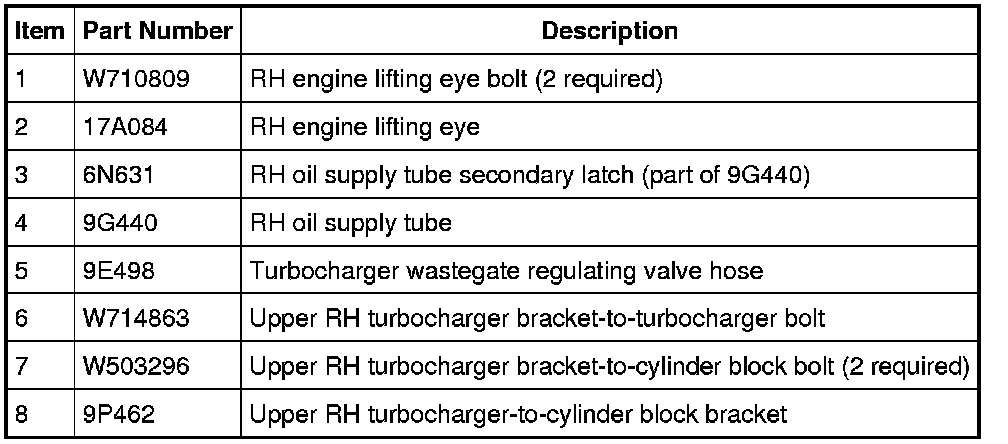 5. Install the RH turbocharger assembly and the upper RH turbocharger-to-cylinder block bracket bolt.