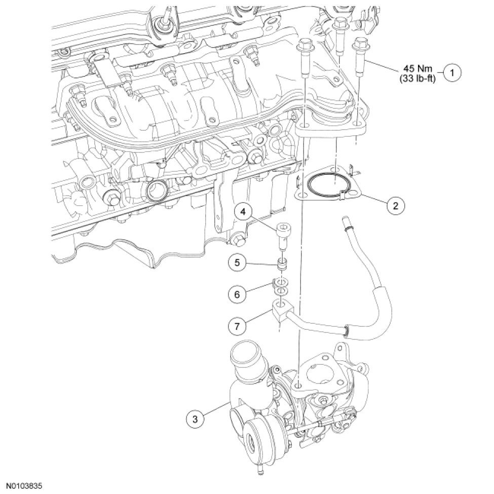 3. NOTICE: The upper RH turbocharger bracket bolts must be loosened in order to perform the tightening sequence or damage to the turbocharger may occur.