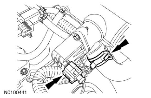 18. Disconnect the LH turbocharger bypass valve electrical connector and the turbocharger bypass valve hose.