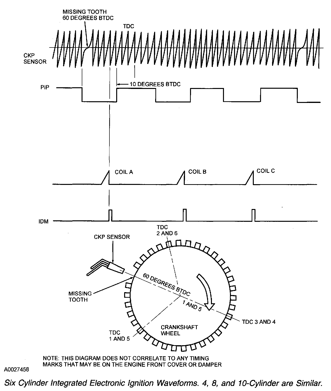 2. The PCM uses the CKP sensor signal to calculate a spark target and then fires the coil pack(s) to that target shown. The PCM uses the CMP sensor signal to identify the compression stroke of cylinder 1, and to synchronize the firing of the individual coils.