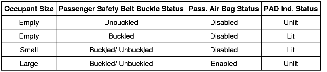 The following table indicates the passenger air bag status and the PAD indicator status based on the size of the front passenger occupant.