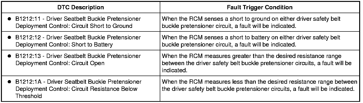 The Restraints Control Module (RCM) monitors driver safety belt buckle pretensioner and circuits for the following faults: