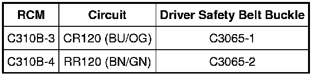 - Measure the resistance between driver safety belt buckle C3065-1, circuit CR120 (BU/OG), harness side and C3065-2, circuit RR120 (BN/GN), harness side.