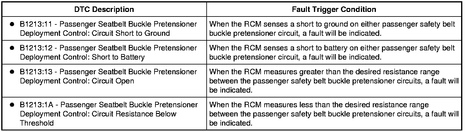 The Restraints Control Module (RCM) continuously monitors passenger safety belt buckle pretensioner and circuits for the following faults: