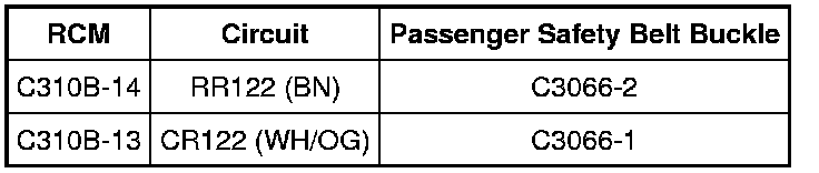 - Measure the resistance between passenger safety belt buckle C3066-1, circuit CR122 (WH/OG), harness side and C3066-2, circuit RR122 (BN), harness side.