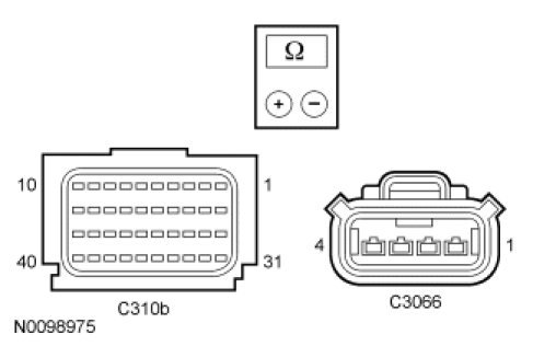 - Measure the resistance between RCM C310B, harness side and passenger safety belt buckle C3066, harness side using the following chart.