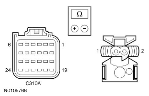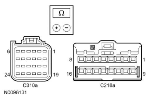 - Measure the resistance between RCM C310A, harness side and clockspring C218A, harness side using the following chart.