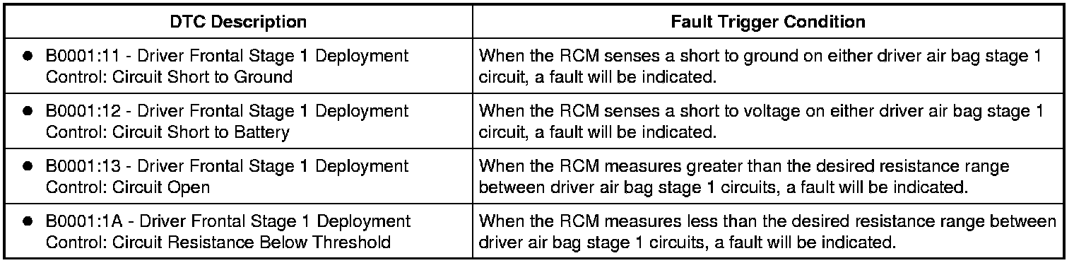 The Restraints Control Module (RCM) continuously monitors the driver air bag module stage 1 and circuits for the following faults:
