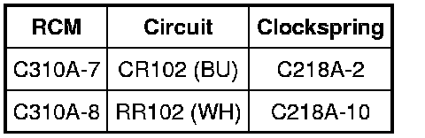 - Measure the resistance between RCM C310A, harness side and clockspring C218A, harness side using the following chart.