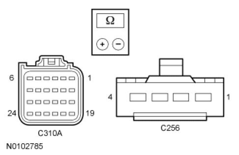- Measure the resistance between RCM C310A, harness side and passenger air bag module C256, harness side using the following chart.