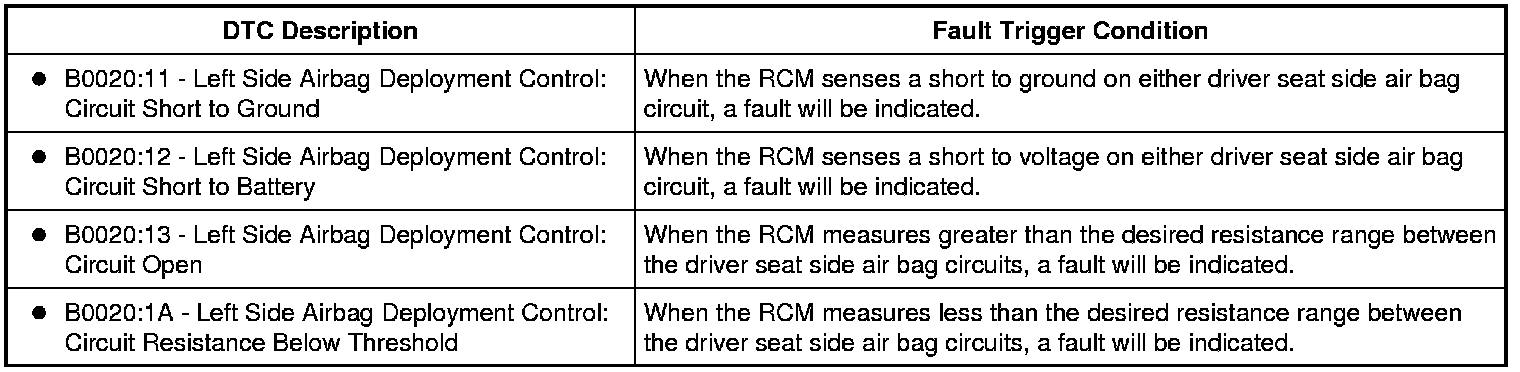 The Restraints Control Module (RCM) continuously monitors the driver seat side air bag module and circuits for the following faults: