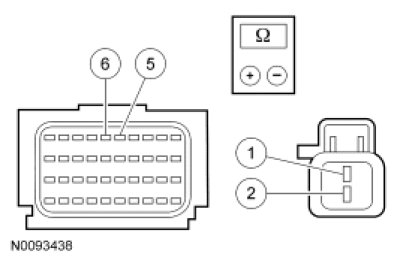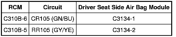 - Measure the resistance between driver seat side air bag module C3134-1, circuit CR105 (GN/BU), harness side and C3134-2, circuit RR105 (GY/YE), harness side.