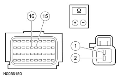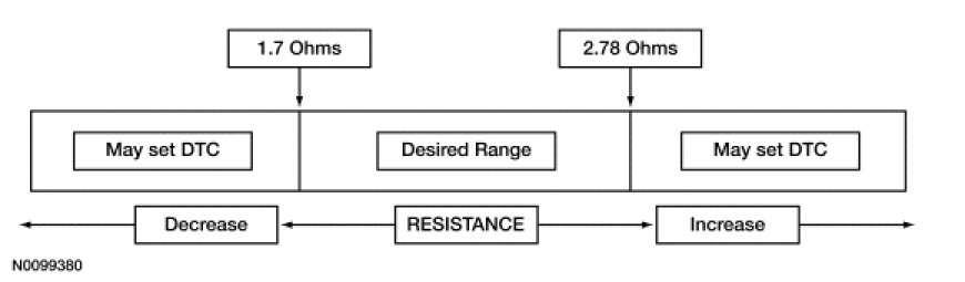 The RCM analyzes the deployment loop resistance and uses this measurement in combination with an age correction factor to determine if a fault exists. The value displayed in the PID is the deployment loop resistance as measured by the RCM. If the value displayed is lower or higher than the desired range (refer to diagram below), the RCM can set a DTC. As the deployment loop resistance drifts farther outside the desired range, the chance for a DTC increases. The RCM fault trigger threshold may vary as the vehicle ages. Small variations in resistance can occur due to the effect of road vibrations on terminal fit and/or temperature changes. These variables can result in an intermittent fault. For this reason, the test will require the PID value to be within the desired range before the fault is considered repaired, regardless if the module is reporting an on-demand DTC at time of diagnosis. Following this direction will help make sure that minor changes in resistance do not create a repeat concern. This test will use a process of elimination to diagnose each part of the deployment loop circuit including: