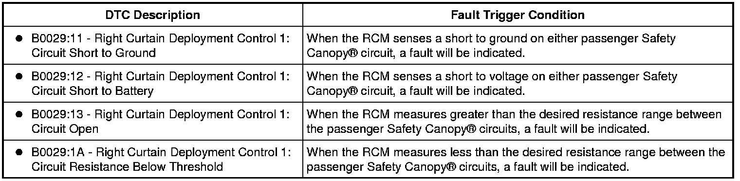 The Restraints Control Module (RCM) continuously monitors the passenger Safety Canopy(R) and circuits for the following faults: