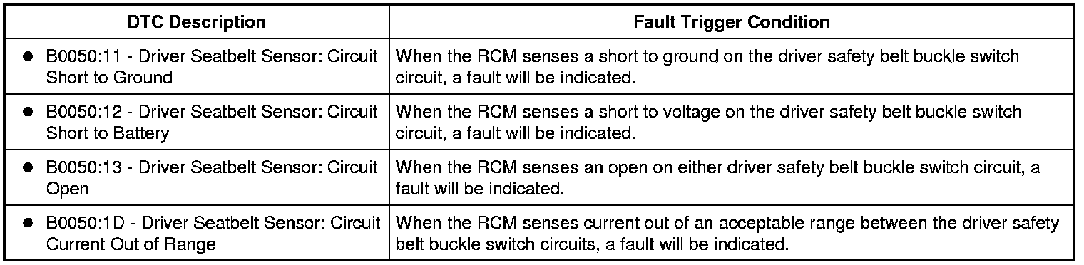 The Restraints Control Module (RCM) monitors the driver safety belt buckle switch and circuits for the following faults: