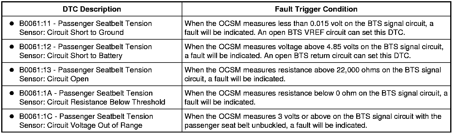 The Occupant Classification System Module (OCSM) monitors the BTS and all circuitry for the following faults: