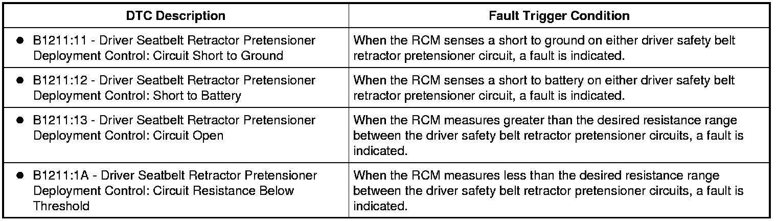 The Restraints Control Module (RCM) continuously monitors the driver safety belt retractor pretensioner and circuits for the following faults: