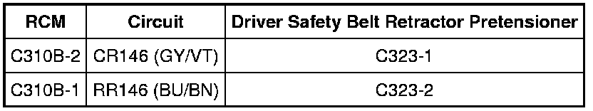 - Measure the resistance between driver safety belt retractor pretensioner C323-1, circuit CR146 (GY/VT), harness side, and C323-2, circuit RR146 (BU/BN), harness side.