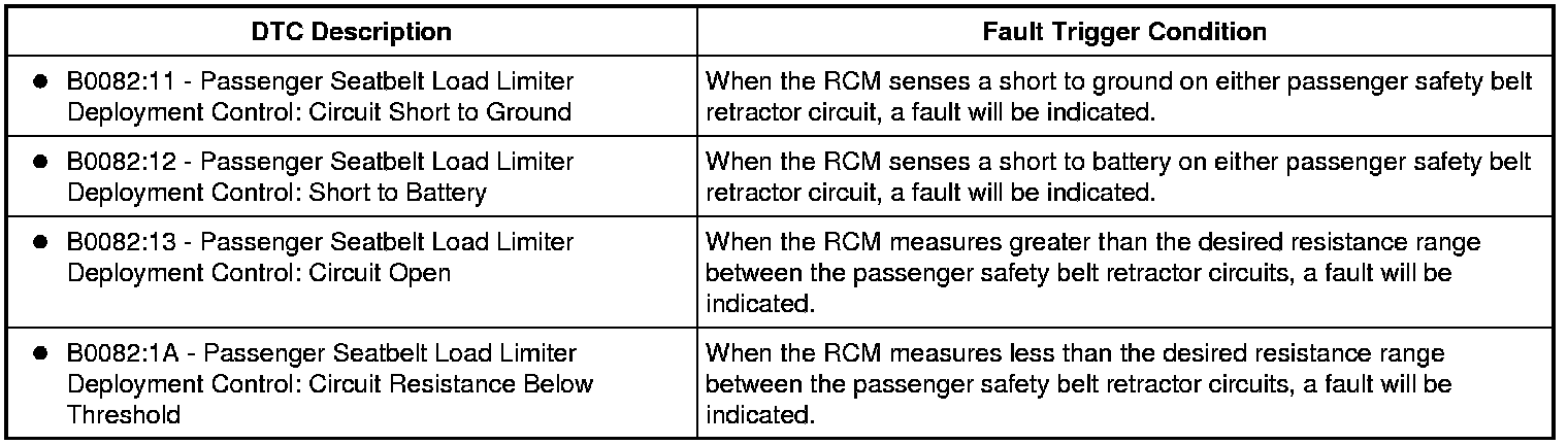 The Restraints Control Module (RCM) continuously monitors the passenger safety belt retractor and circuits for the following faults: