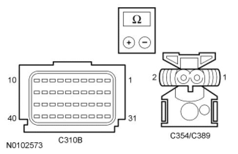 - Measure the resistance between RCM C310B, and passenger safety belt retractor C389, harness side using the following chart.