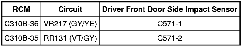 - Connect a fused jumper wire between driver front door side impact sensor C571-1, circuit VR217 (GY/YE), harness side and C571-2, circuit RR131 (VT/GY), harness side.