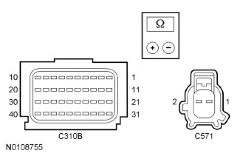 - Measure the resistance between RCM C310B, harness side and driver front door side impact sensor C571, harness side using the following chart.