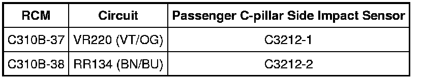 - Connect a fused jumper wire between passenger C-pillar side impact sensor C3212-1, circuit VR220 (VT/OG), harness side and C3212-2, circuit RR134 (BN/BU), harness side.