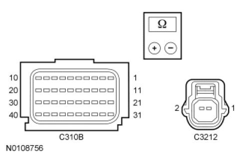 - Measure the resistance between RCM C310B, harness side and passenger C-pillar side impact sensor C3212, harness side using the following chart.