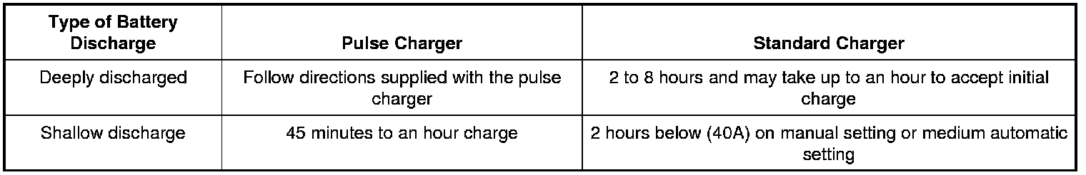 NOTE: Battery chargers have improved greatly with the addition of the new generation pulse chargers. These chargers pulse current into the battery, breaking down the sulfation layer on the battery plates and generally reduce charging times to less than an hour.