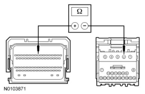 - Measure the resistance between the start diode, circuit CE336 (GN/WH), harness side and BJB starter relay pin 1, circuit CE336 (GN/WH), harness side.