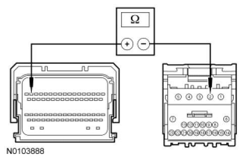 - Measure the resistance between the RFA module C2153B-2, circuit CDC35 (BU/WH), harness side and start diode, circuit CDC35 (BU/WH), harness side.