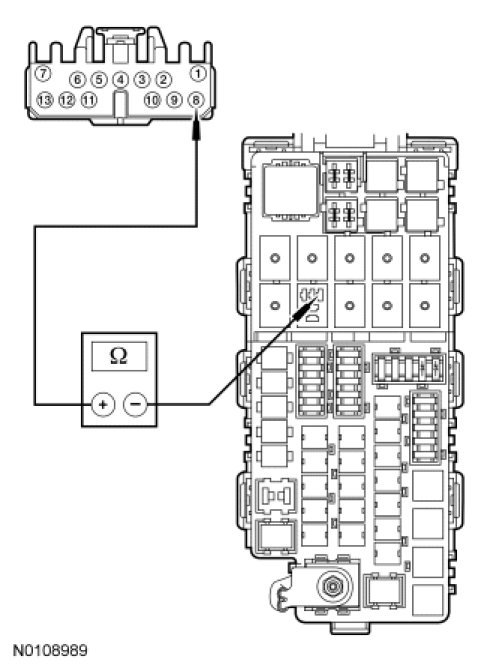 - Measure the resistance between the BJB starter relay pin 1, circuit CE336 (GN/WH), harness side and SJB C2280E-8, circuit CE336 (GN/WH), harness side.