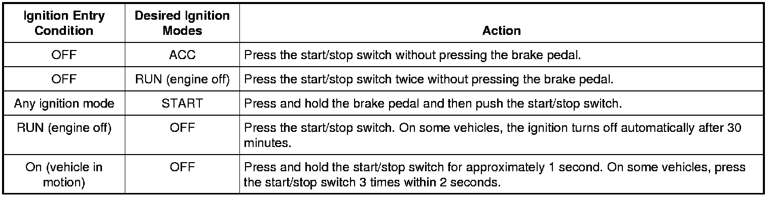 The start/stop switch is used in conjunction with the Intelligent Access (IA) key and brake pedal to achieve the different ignition modes as indicated in the table below. For additional information on the IA key, refer to Anti-Theft - Passive Anti-Theft System (PATS) Anti-Theft - Passive Anti-Theft System (PATS).