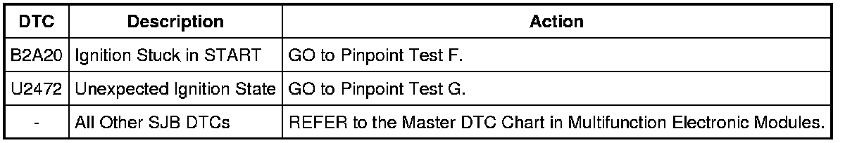 NOTE: Any push button start system fault will result in DTCs being stored in both the Remote Function Actuator (RFA) module and the Smart Junction Box (SJB). Correct all RFA module DTCs prior to diagnosing the SJB DTCs listed below.
