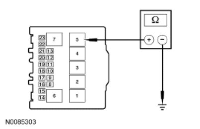 - Measure the resistance between RFA module C2153B-5, circuit CDC34 (WH/OG), harness side and ground.