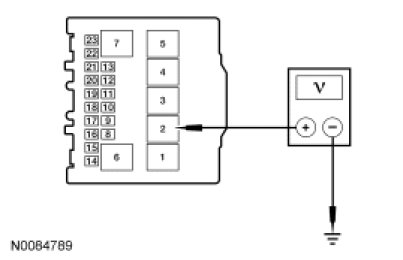 - While applying the brake pedal, measure the voltage between RFA module C2153E-2, circuit CLS43 (YE/GN), harness side and ground.