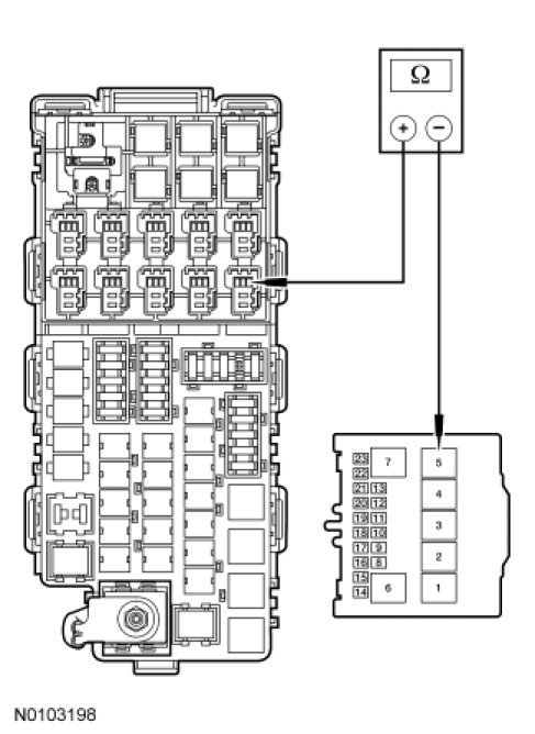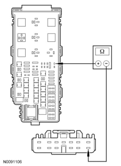 - Measure the resistance between SJB C2280A-3, circuit CDC33 (VT/GN), harness side and RFA module C2153B-4, circuit CDC33 (VT/GN), harness side.