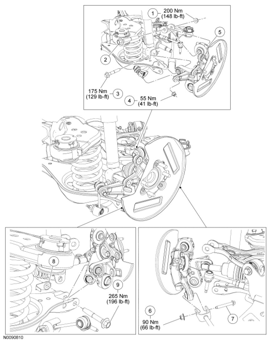10. Tighten the lower arm-to-wheel knuckle bolt to 265 Nm (196 lb-ft).