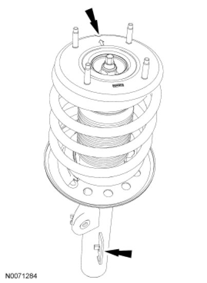 - position the notch and arrow on the upper strut mount outboard opposite the locator tab on the strut.