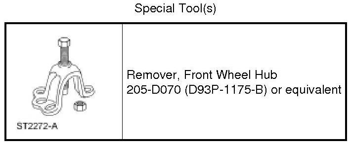 12. NOTICE: Do not tighten the front wheel hub nut with the vehicle on the ground. The nut must be tightened to specification before the vehicle is lowered onto the wheels. Wheel bearing damage will occur if the wheel bearing is loaded with the weight of the vehicle applied.