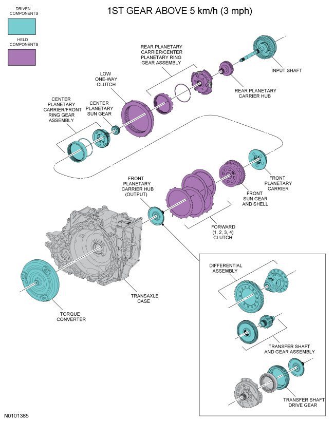 NOTE: The transaxle operates differently in 1st gear above and below 5 km/h (3 mph). For transaxle operation below 5 km/h (3 mph), refer to Manual LOW Position and 1st Gear Below 5 km/h (3 mph).