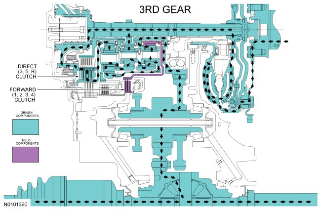 - SSA applies pressure to the forward (1, 2, 3, 4) clutch regulator valve to apply the forward clutch.