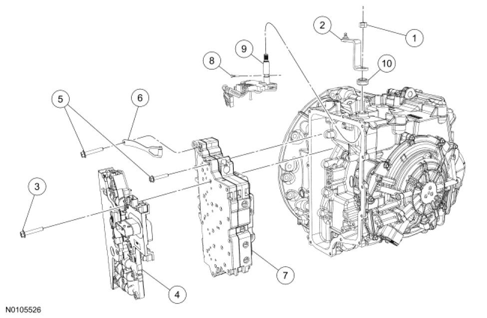 6. Install the TR sensor detent spring and the 10 valve body-to-case bolts. Tighten the bolts in the sequence shown.