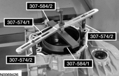 Install the Forward Clutch Spring Compressor 307-574 (307-574/1 and 307-574/2) and the Forward/Intermediate Spring Compressor 307-584 (307-584/1 and 307-584/2) and compress the forward clutch piston return spring.