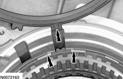 73. Compare the position of the low OWC snap ring gap with the tab on the low/reverse clutch pressure plate to be sure that the gap is in the right position.