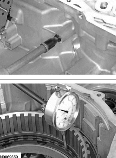 76. Apply 483 kPa (70 psi) of air pressure to the forward clutch piston port while recording the clutch pack clearance on the Dial Indicator Gauge. The clearance should be between 0.85 mm (0.033 in) and 2.41 mm (0.094 in). If the clearance is out of range, check the forward clutch pack and low OWC for correct installation. If the forward clutch pack and low OWC is correctly installed, install a new forward clutch pack.